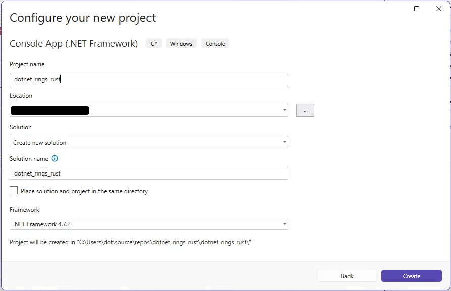 - In the Configure your new project dialogue, type a project name and select .NET Framework 4.7.2 as the target framework.